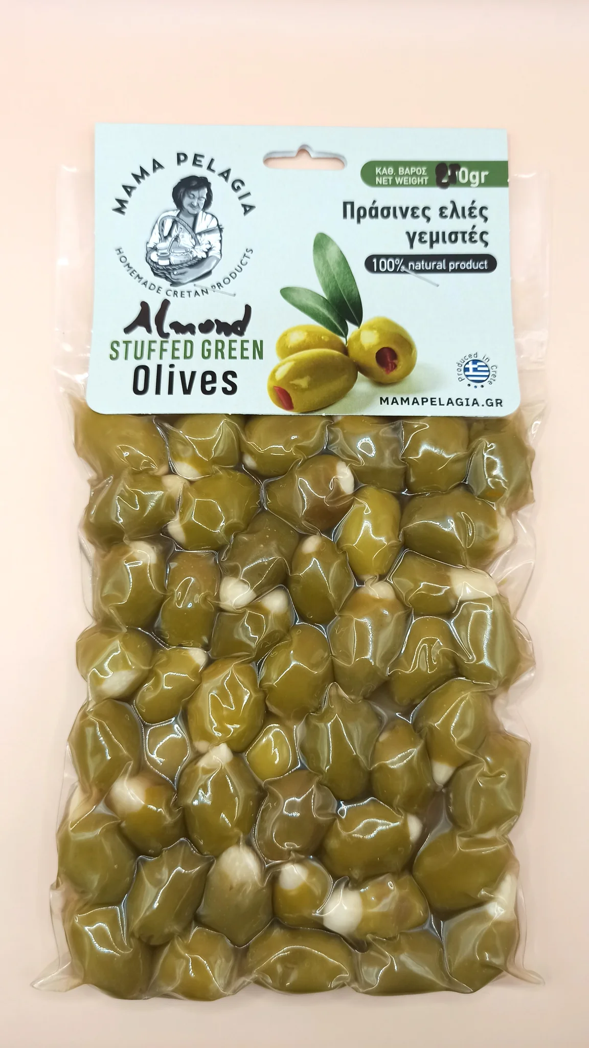 Πράσινες γεμιστές με αμύγδαλα και διατηρημένες σε φυσική άλμη χαμηλή σε αλάτι.
